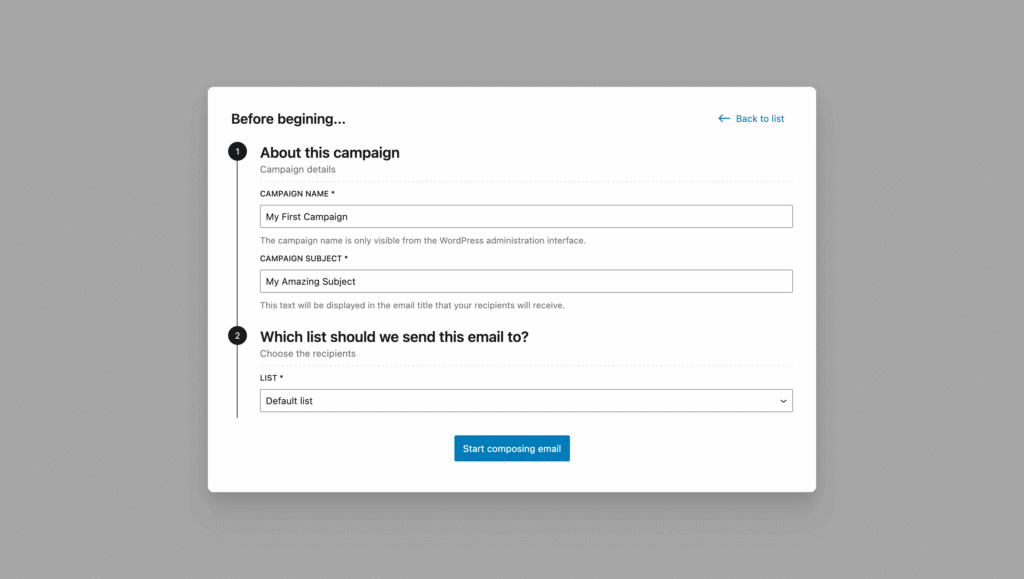 - a campaign name: will be visible only from MailerPress, Campaigns page.