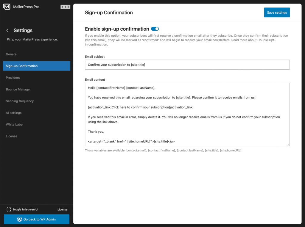 From your WordPress administration, MailerPress, Settings, Sign-up Confirmation, enable the “Enable sign-up confirmation” toggle.