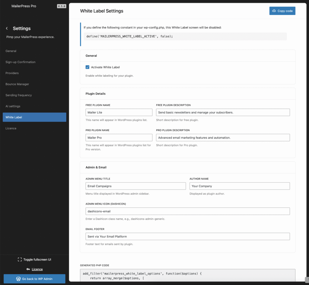 To set these settings using PHP code, just copy-paste the snippet provided from the White Label settings page to your functions.php file of your child/theme or inside a must use plugins.