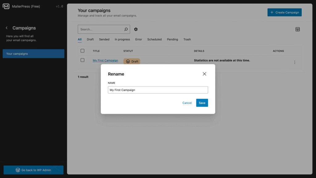 From MailerPress, Campaigns, Your Campaigns page, click Create Campaign button and follow our complete guide to create your first email campaign with MailerPress.